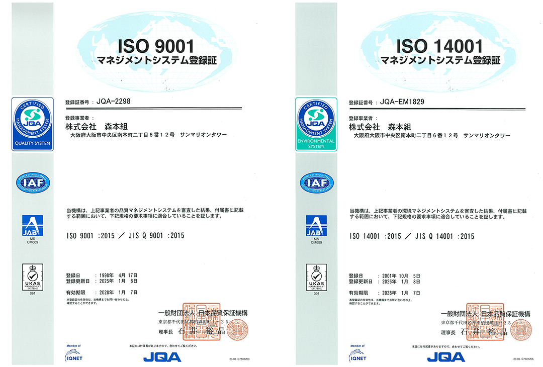 森本組は品質マネジメントシステムQMS、環境マネジメントシステムEMSをそれぞれ取得し個別に運用を行なってきましたが、QMSとEMSを統合したマネジメントシステムであるIMSを2010年より全支店・全事業所で運用を開始しました。
